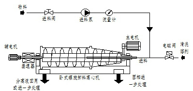 下圖描述了離心機的主要設備和系統(tǒng)進行工作時的工藝流程,該系統(tǒng)主要包括臥式螺旋卸料沉降離心機(主機)、電器控制系統(tǒng)、無軸輸送機、自動控制加藥系統(tǒng)。